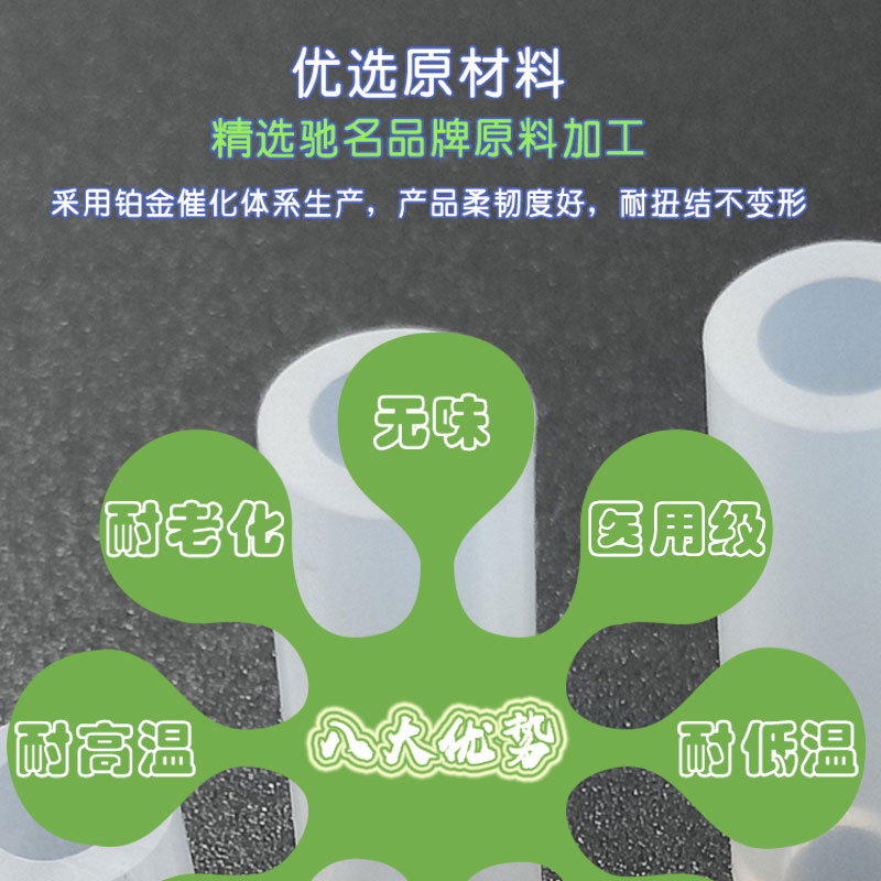薊鉑金氣腹機(jī)硅膠管:采用進(jìn)口硅膠原材料,連續(xù)擠出一次成型,內(nèi)壁平滑;常規(guī)硬度60度(邵氏硬度30-90度);耐溫范圍廣(-50~+280℃),可以適應(yīng)高、低溫設(shè)備需求,并耐老化。常規(guī)PE袋+紙箱包裝,特殊要求可按客戶標(biāo)準(zhǔn);產(chǎn)品符合SGS、FDA、LFGB、生物相溶性等;用于呼吸機(jī)、麻醉機(jī)、制氧機(jī)、輸氧機(jī)管道等。